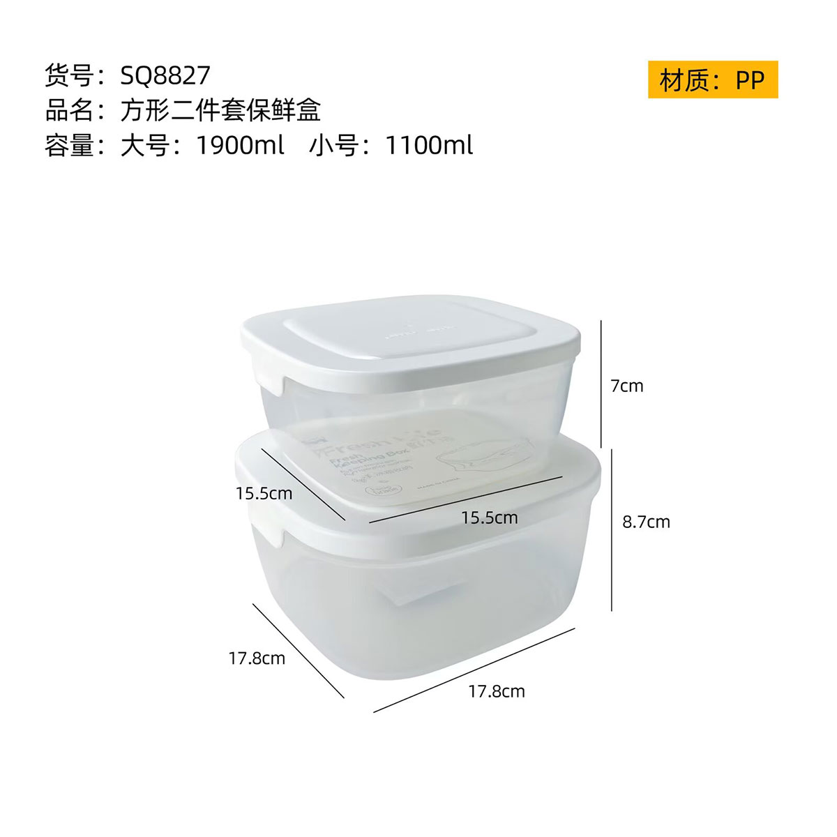 Size: SQ-8827(二件套):中號(hào):155*155*70mm/1100ml 大號(hào):178*178*87mm/1900ml