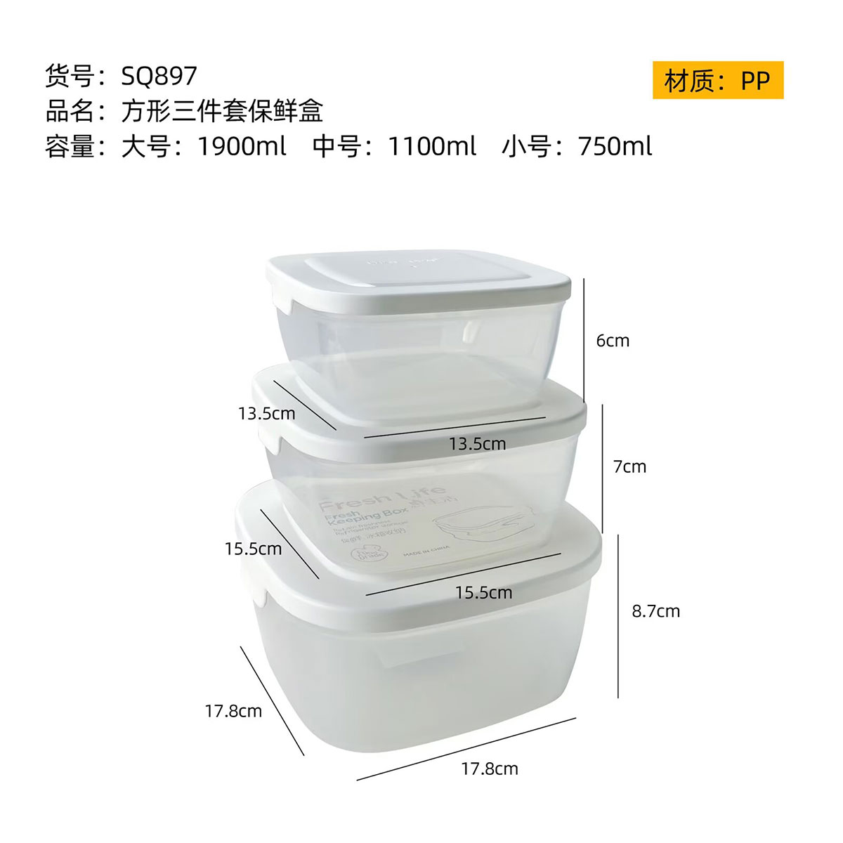 SQ-897(三件套):小號(hào):135*135*60mm/750ml 中號(hào):155*155*70mm/1100ml 大號(hào):178*178*87mm/1900ml