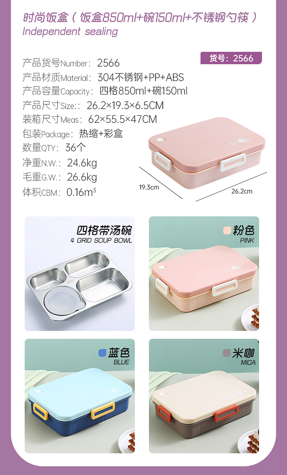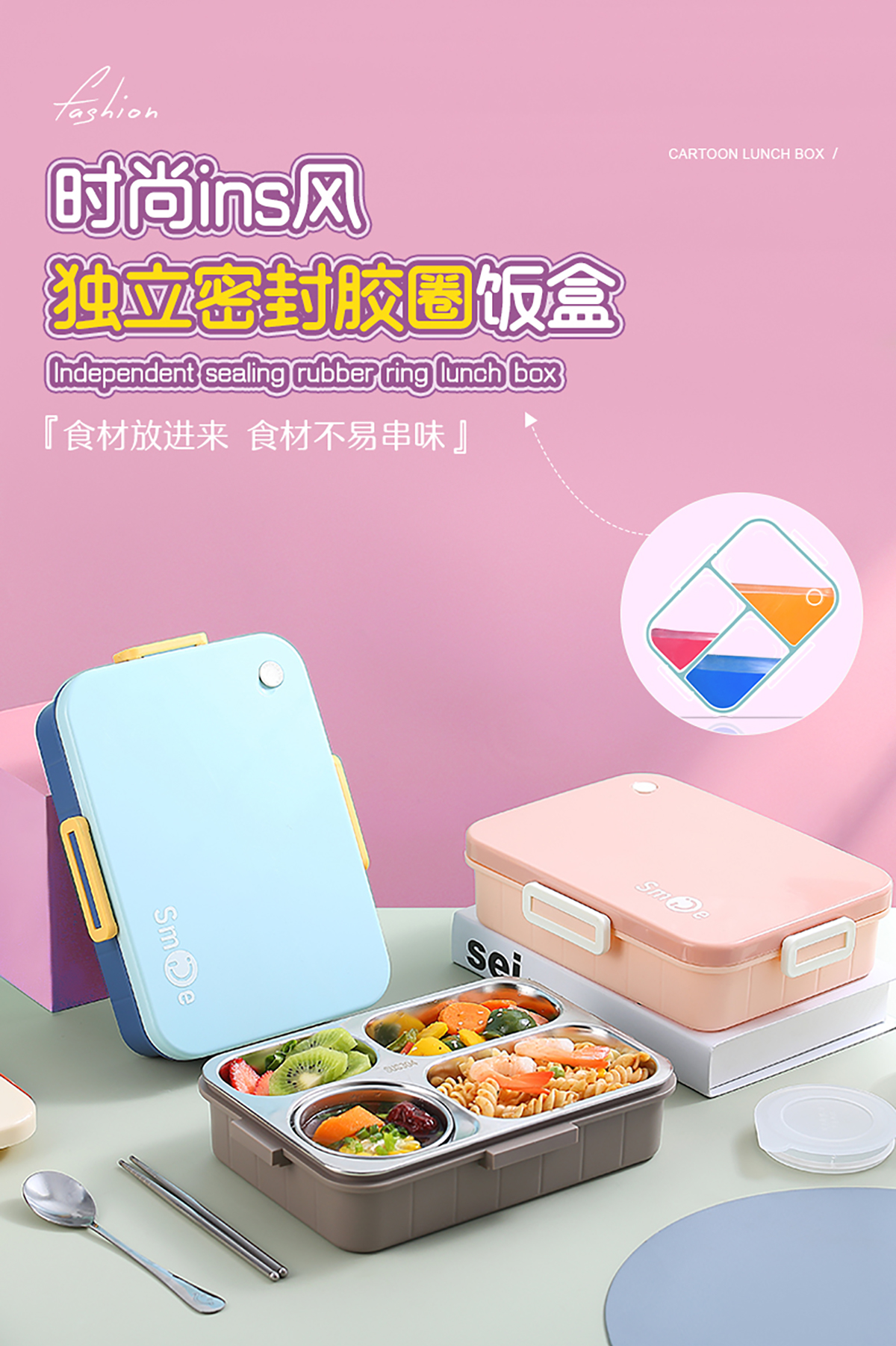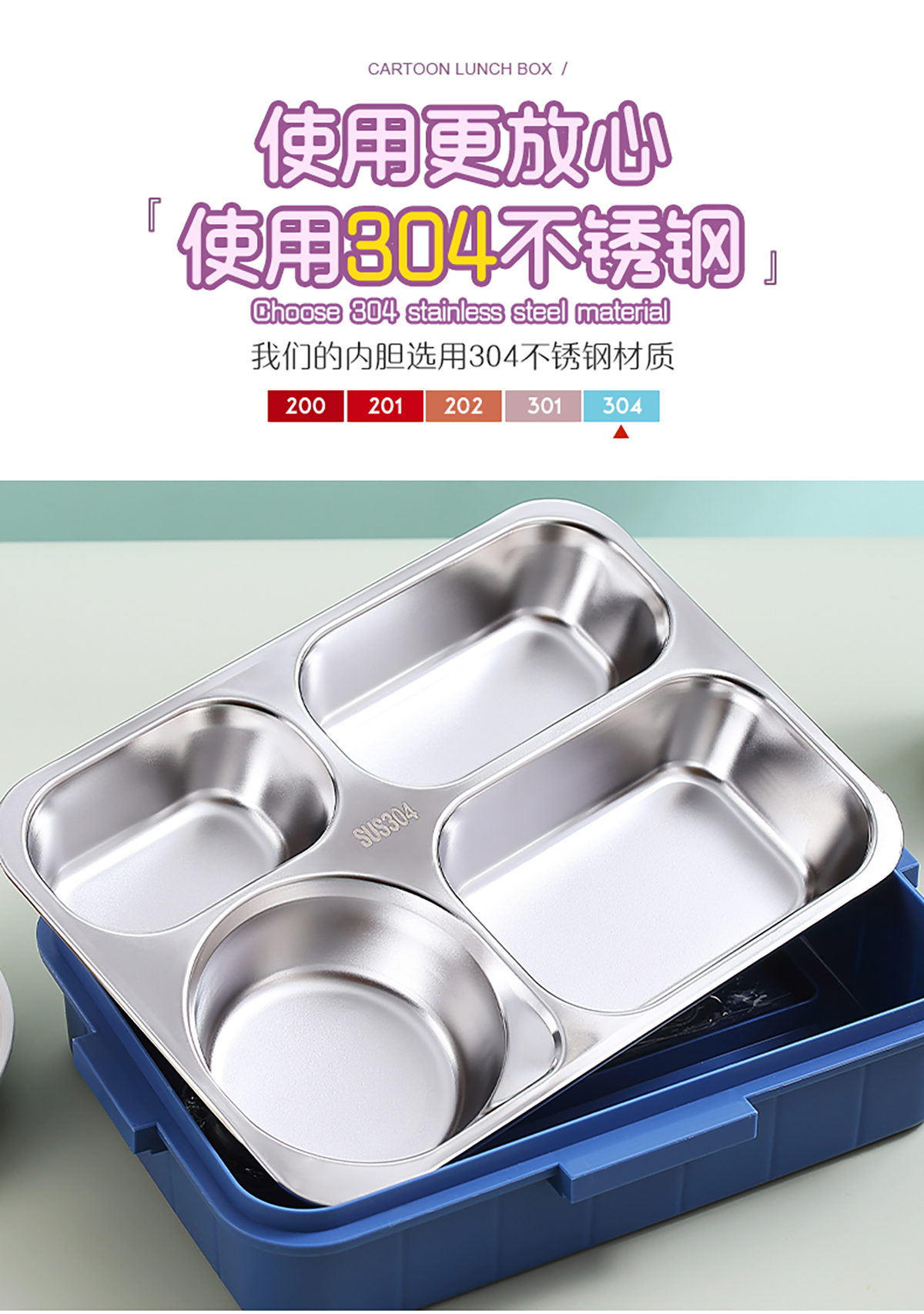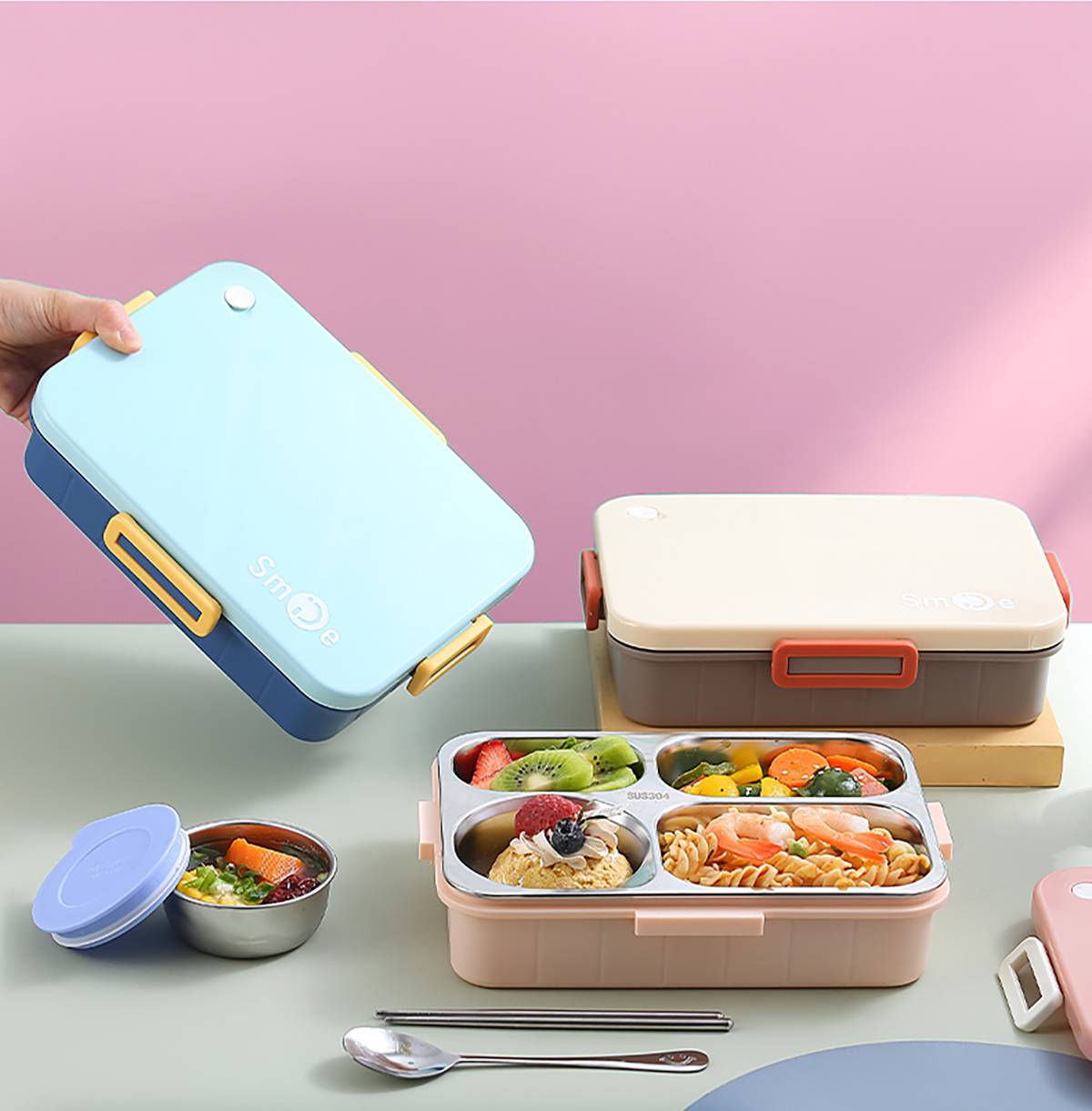 900ml獨立密封不銹鋼餐盒(時尚四格+不銹鋼勺筷/碗150ml不銹鋼勺筷)