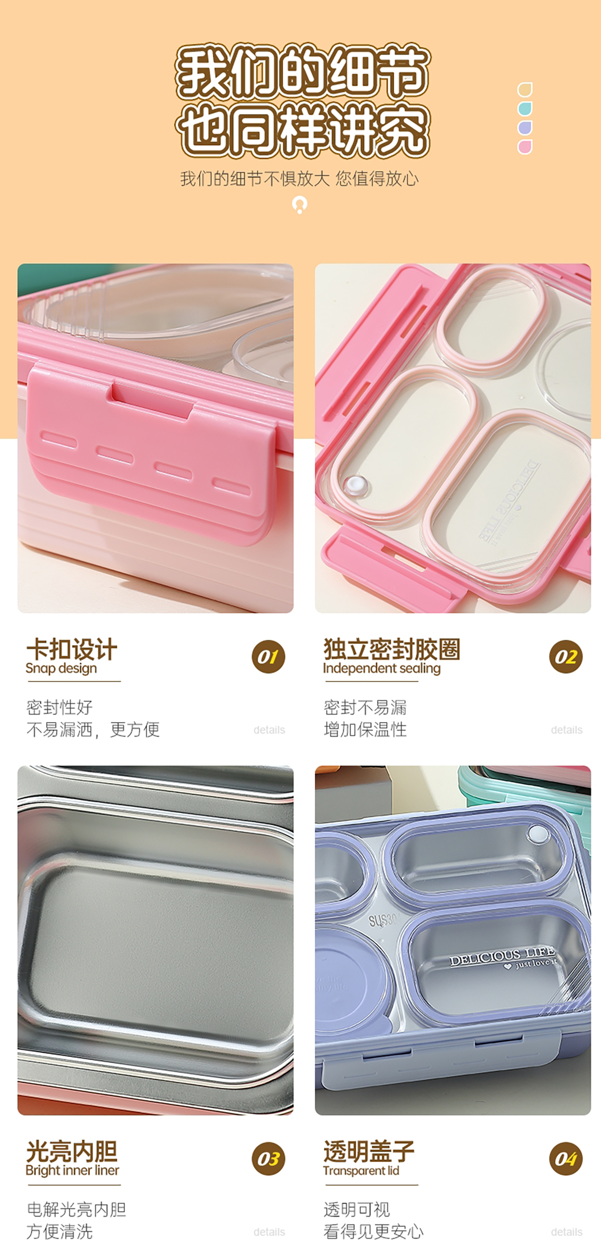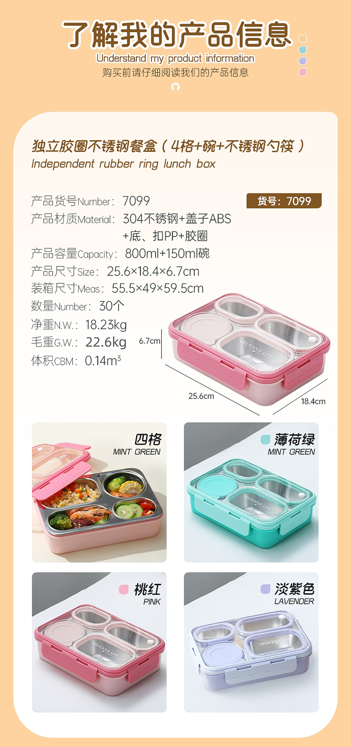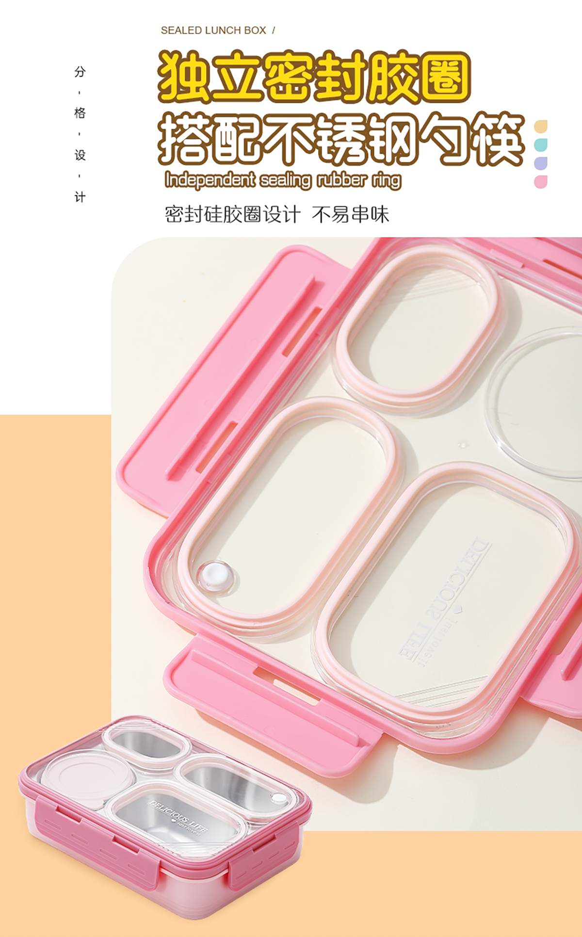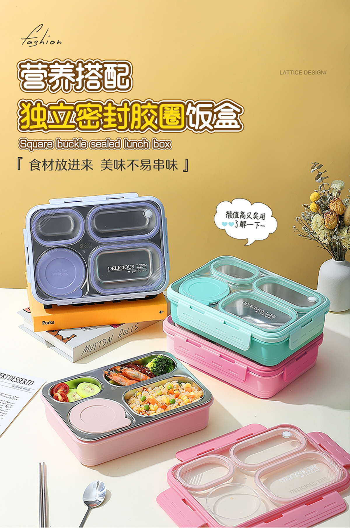中號4格不串味不銹鋼餐盒帶碗800ml+150ml碗