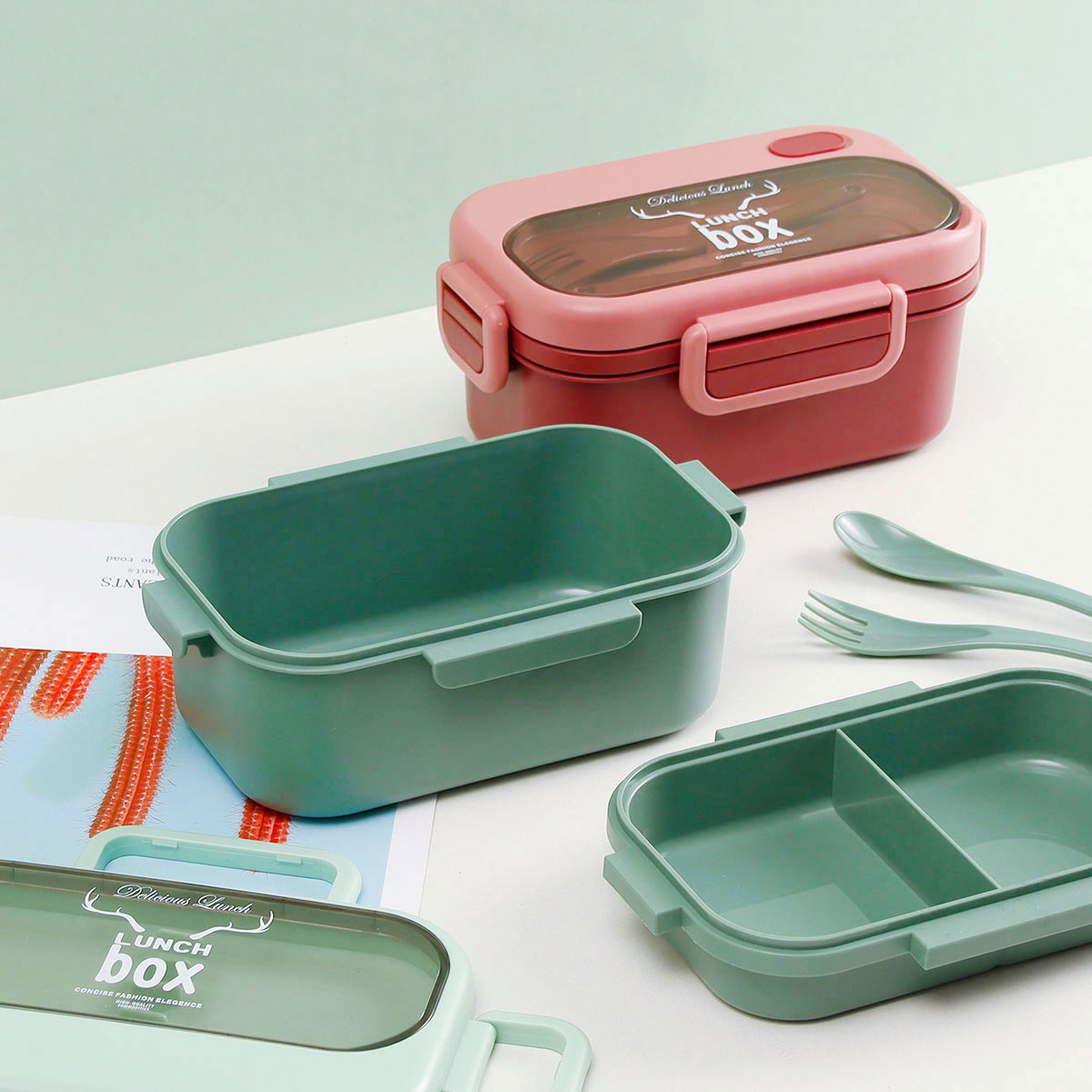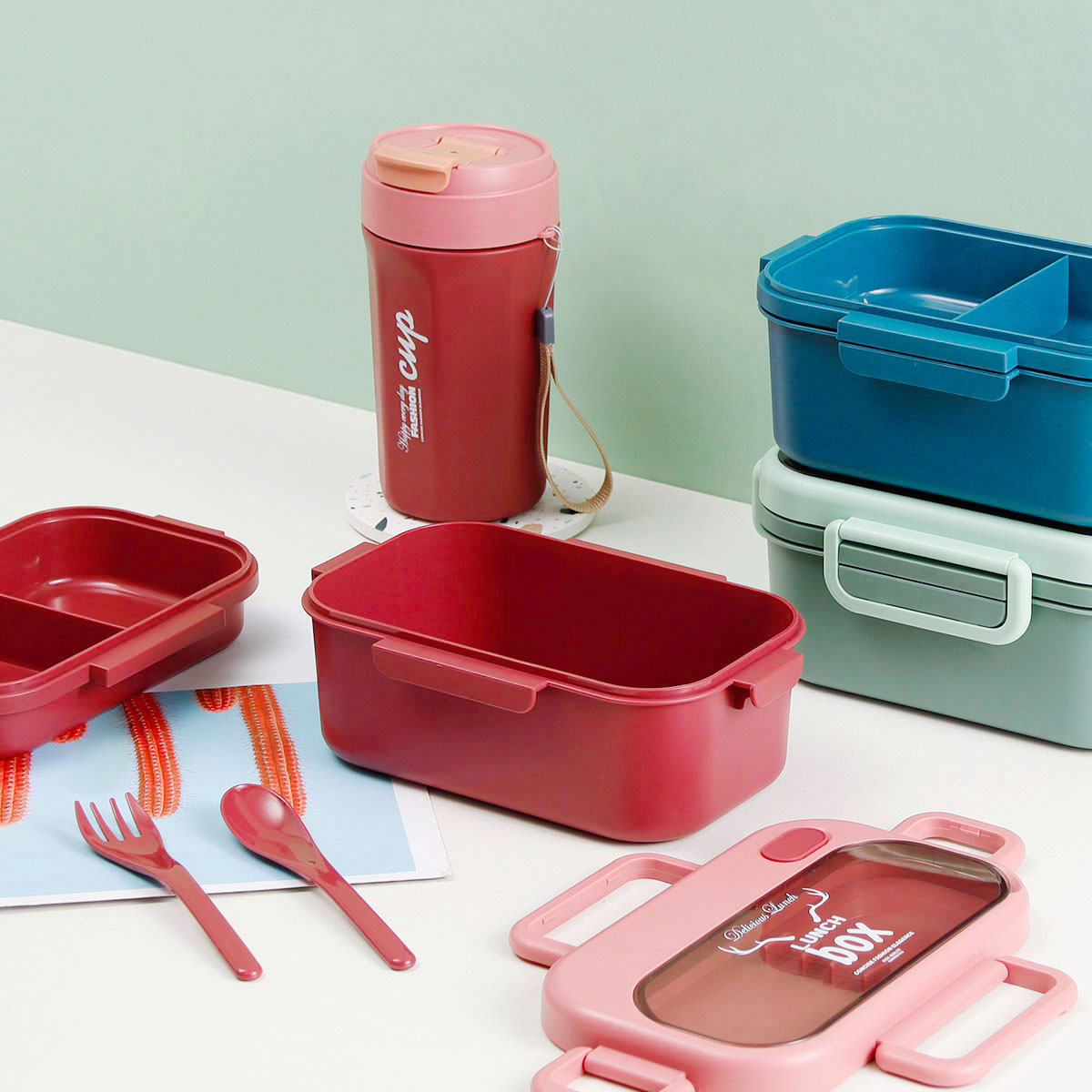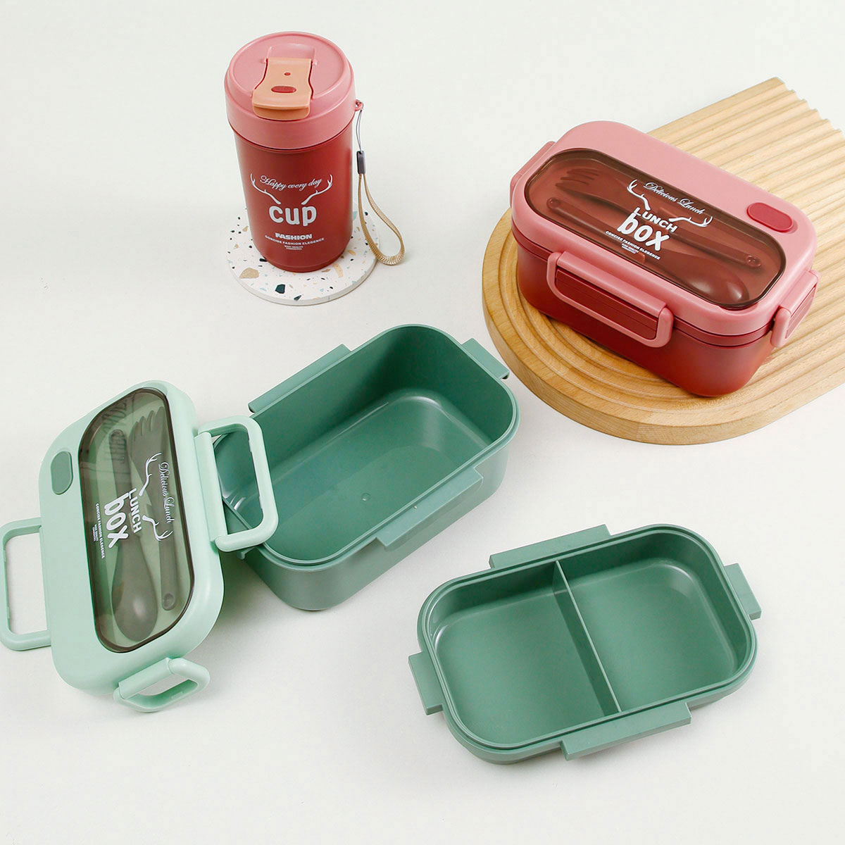 品悅長方雙層密封飯盒(1100ml)+圓形/八角隨行杯(500ml)