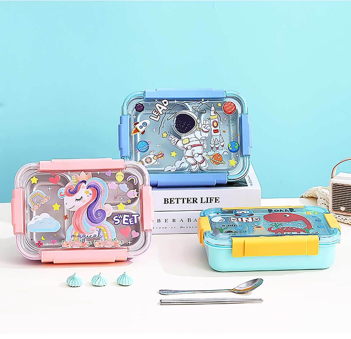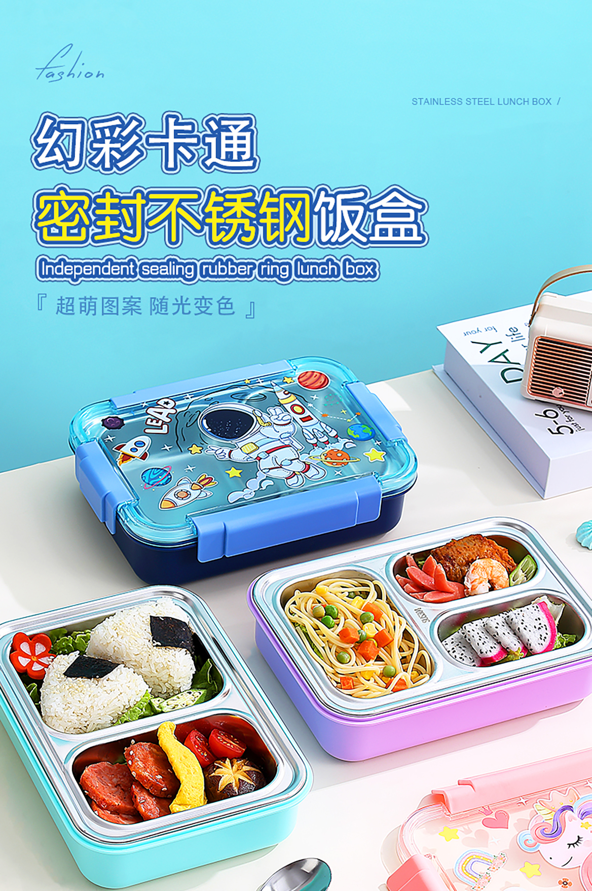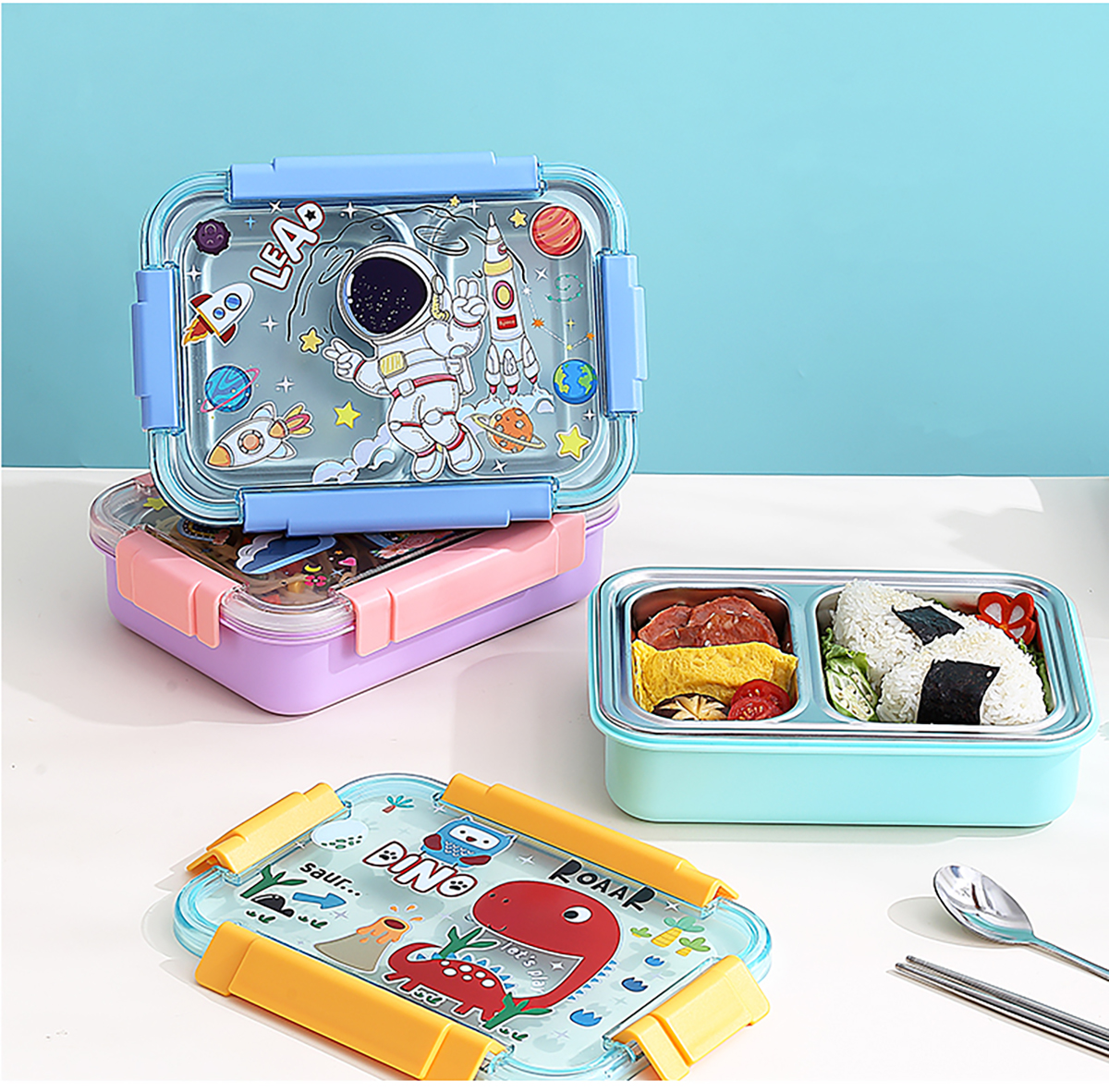 幻彩卡通密封不銹鋼餐盒(2格750ml/3格710ml+不銹鋼筷勺)