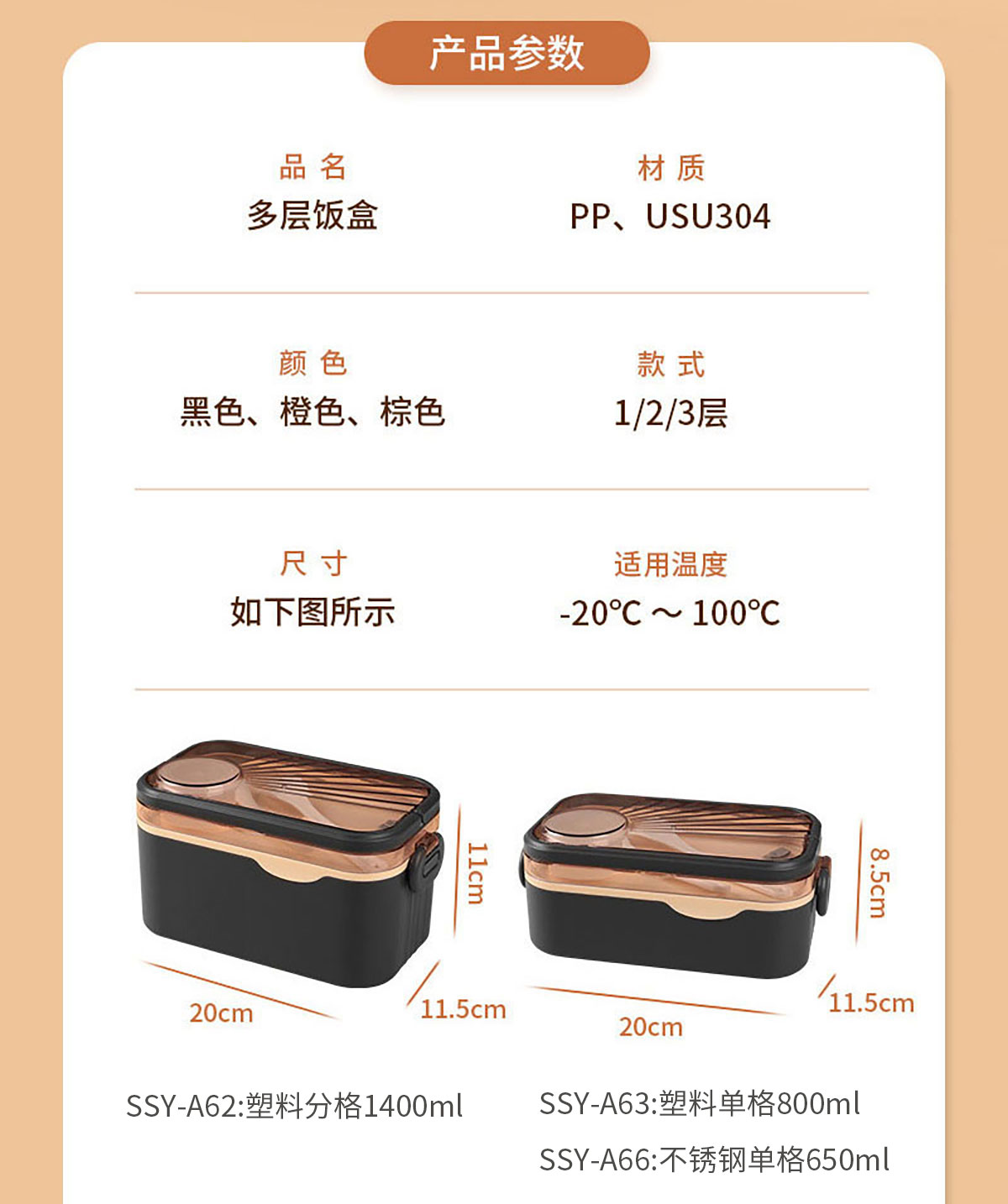 SSY-A68(不銹鋼三格):200*115*200mm/2400ml