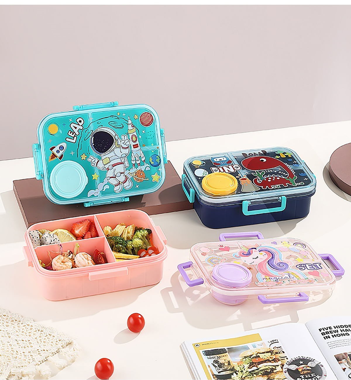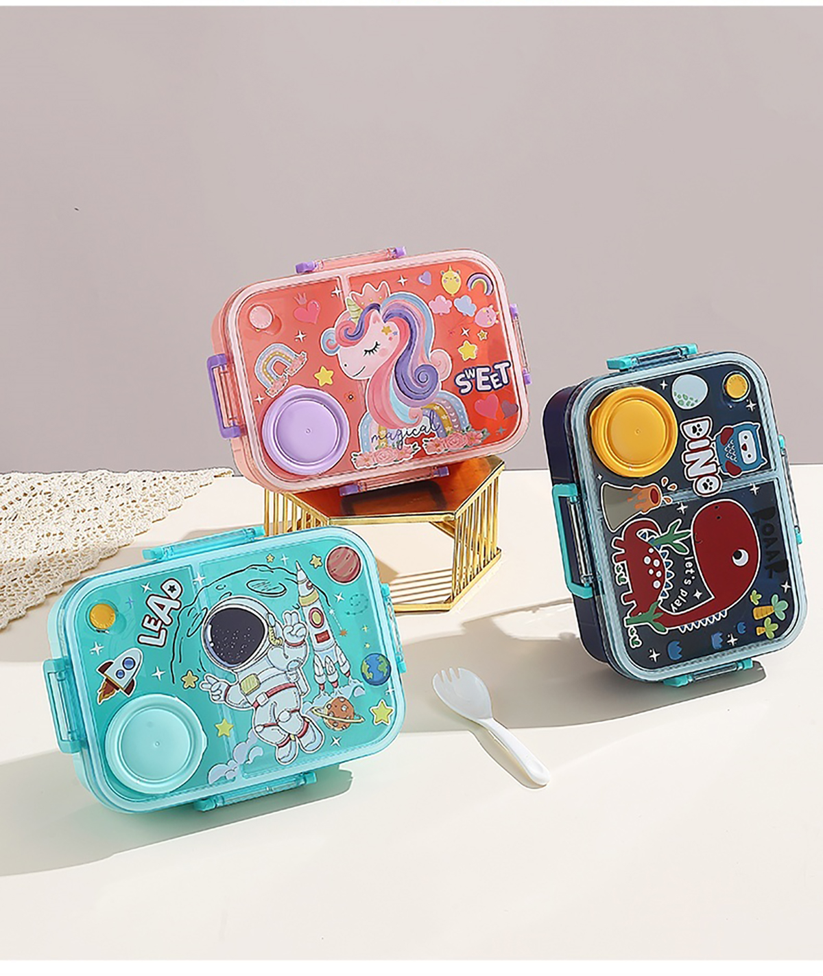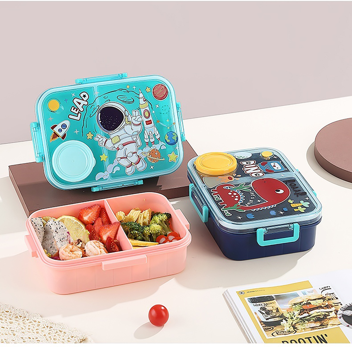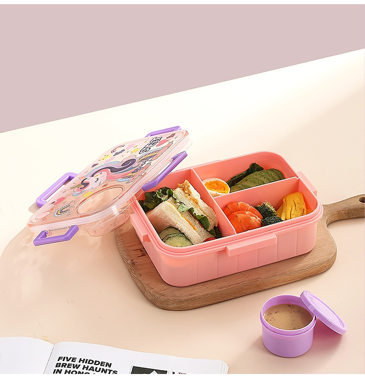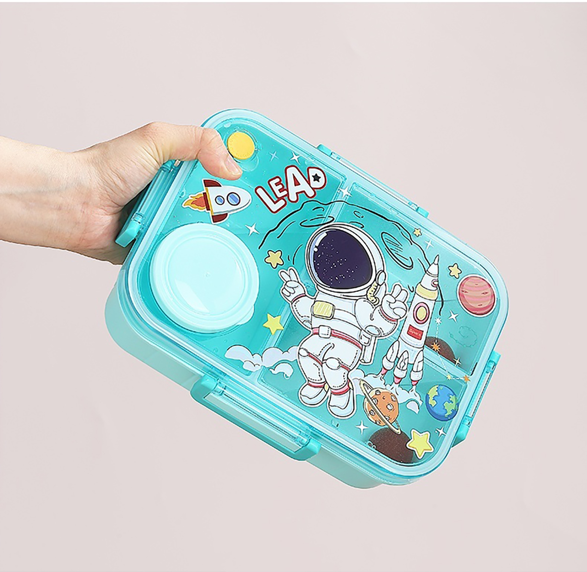 1.2L幻彩卡通獨(dú)立密封塑料餐盒(2格/3格+醬杯80ml+PP勺)