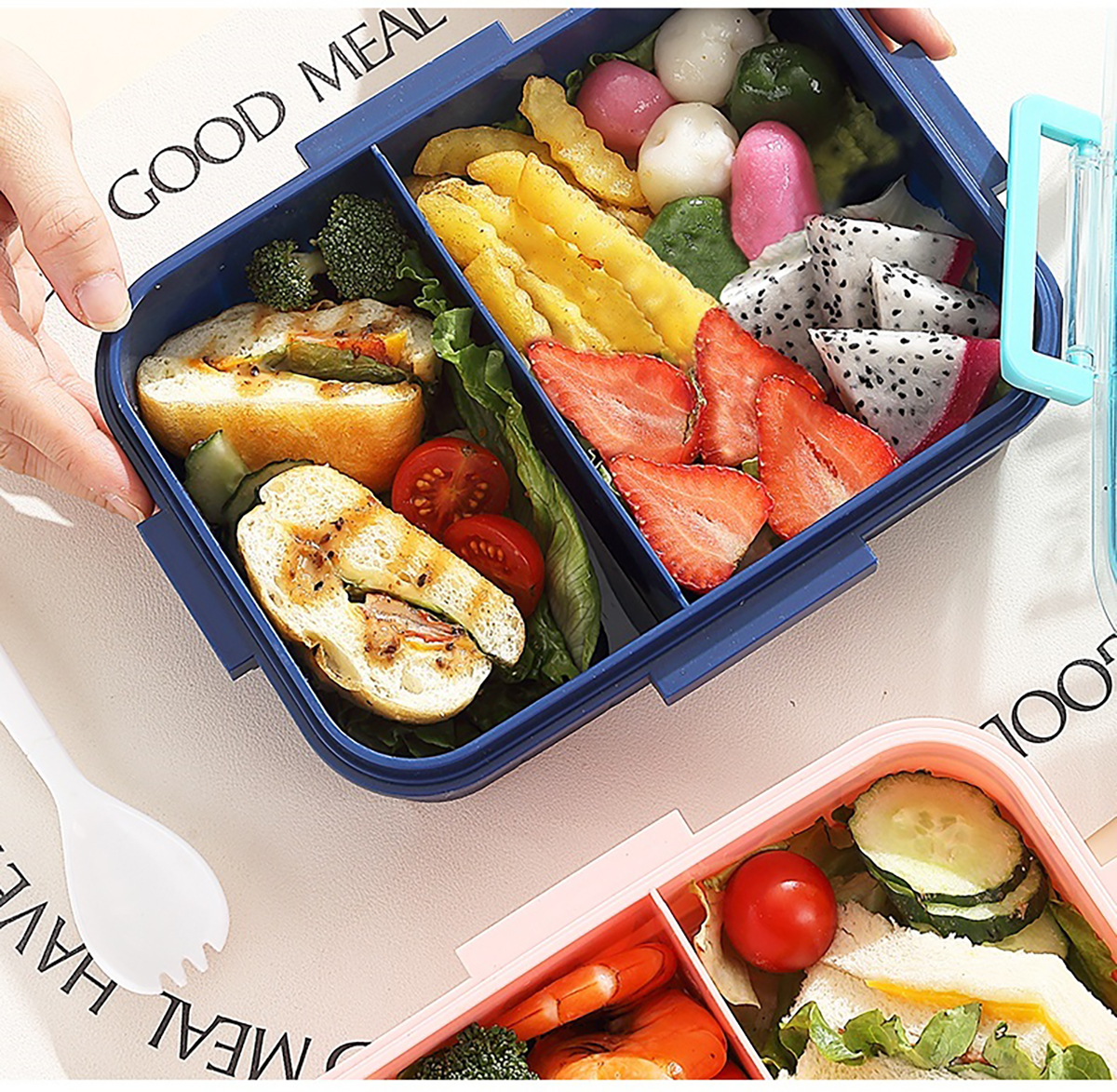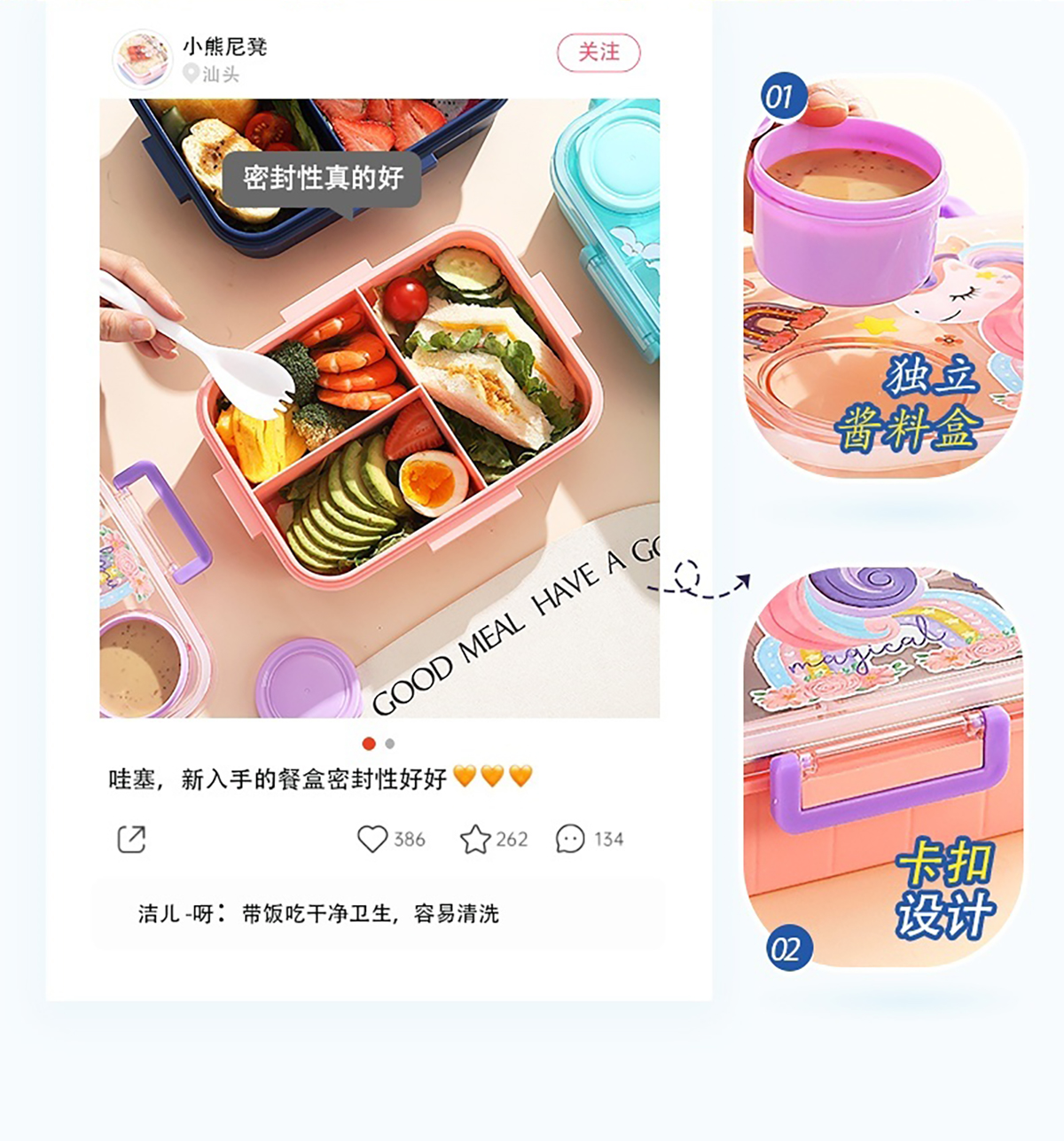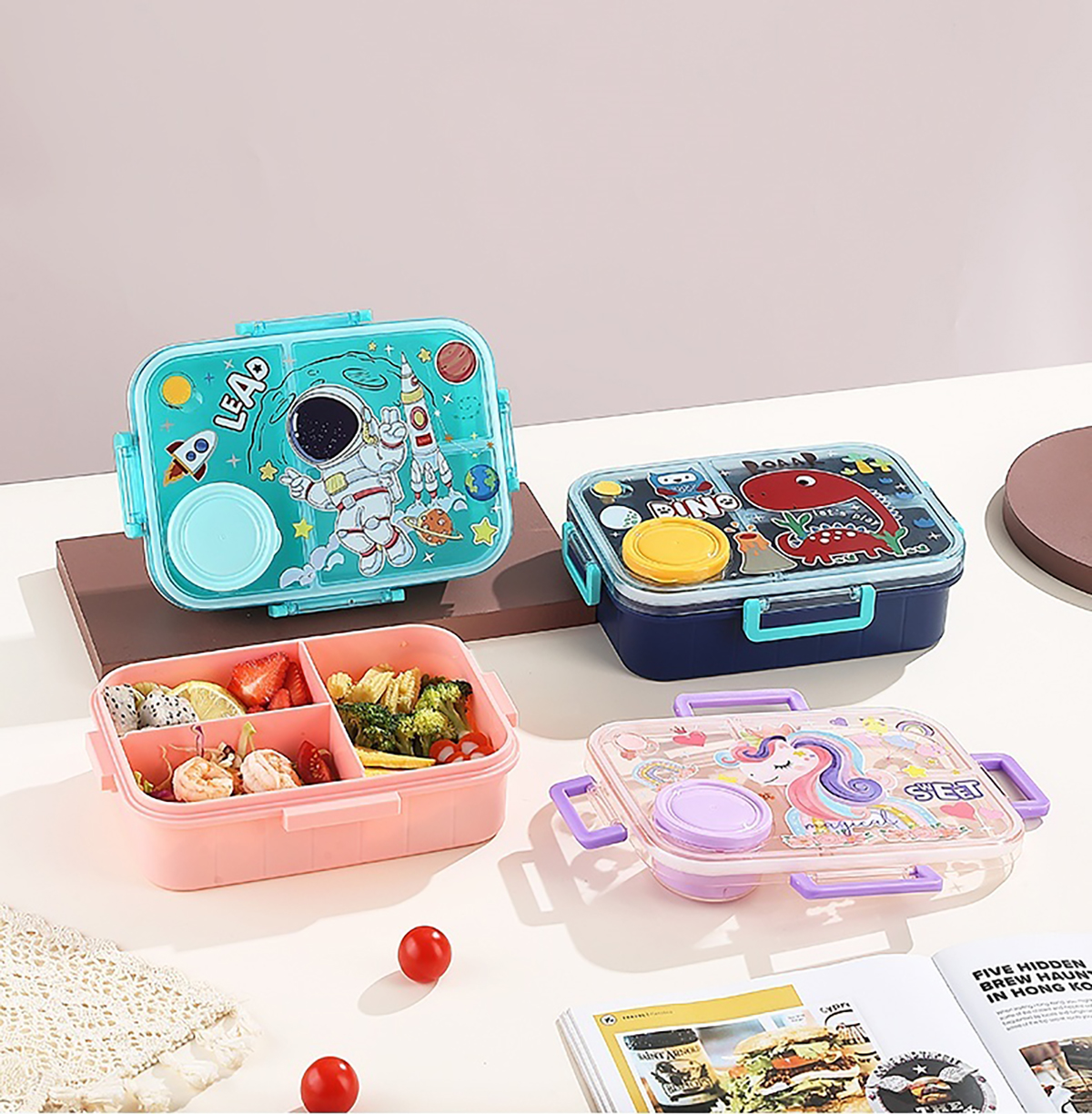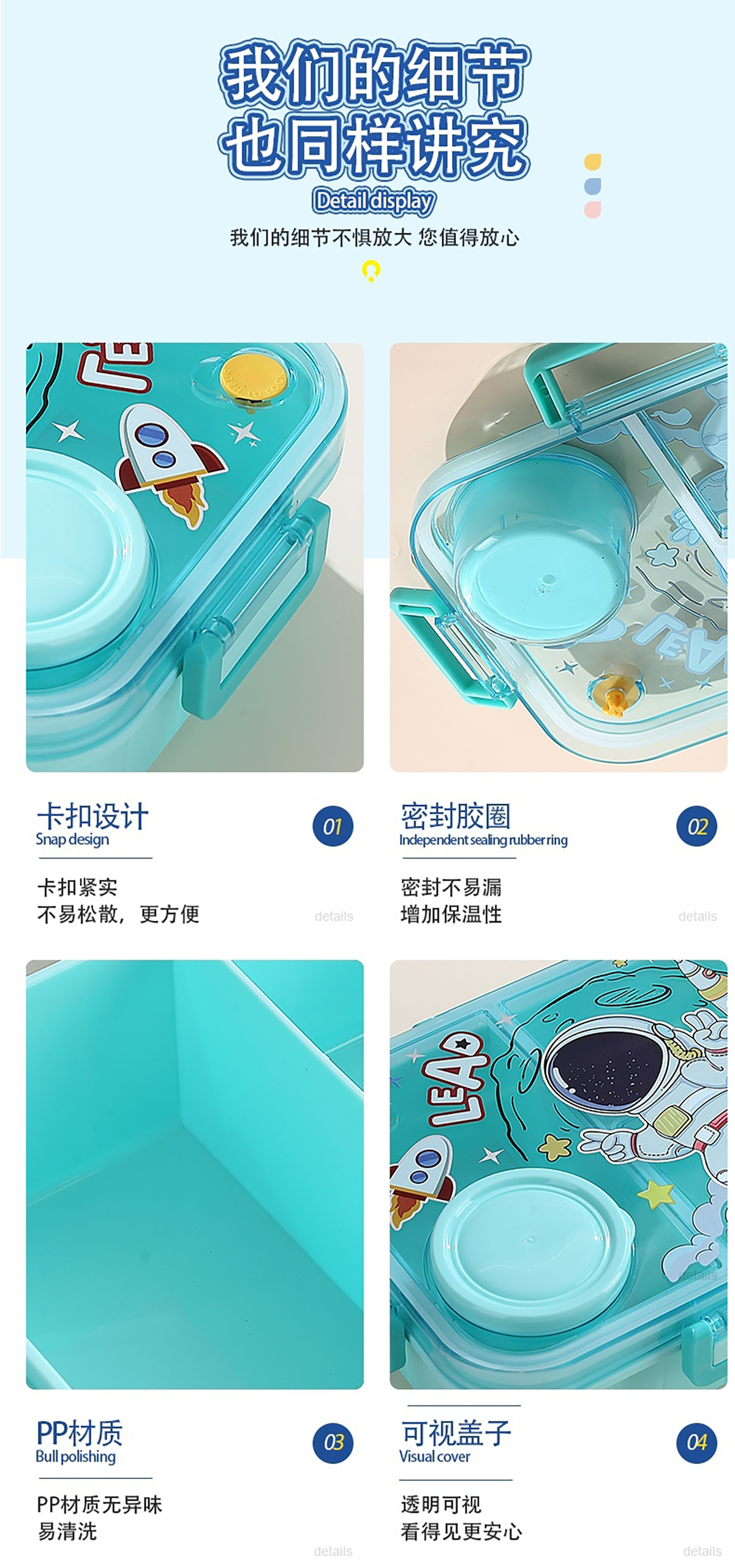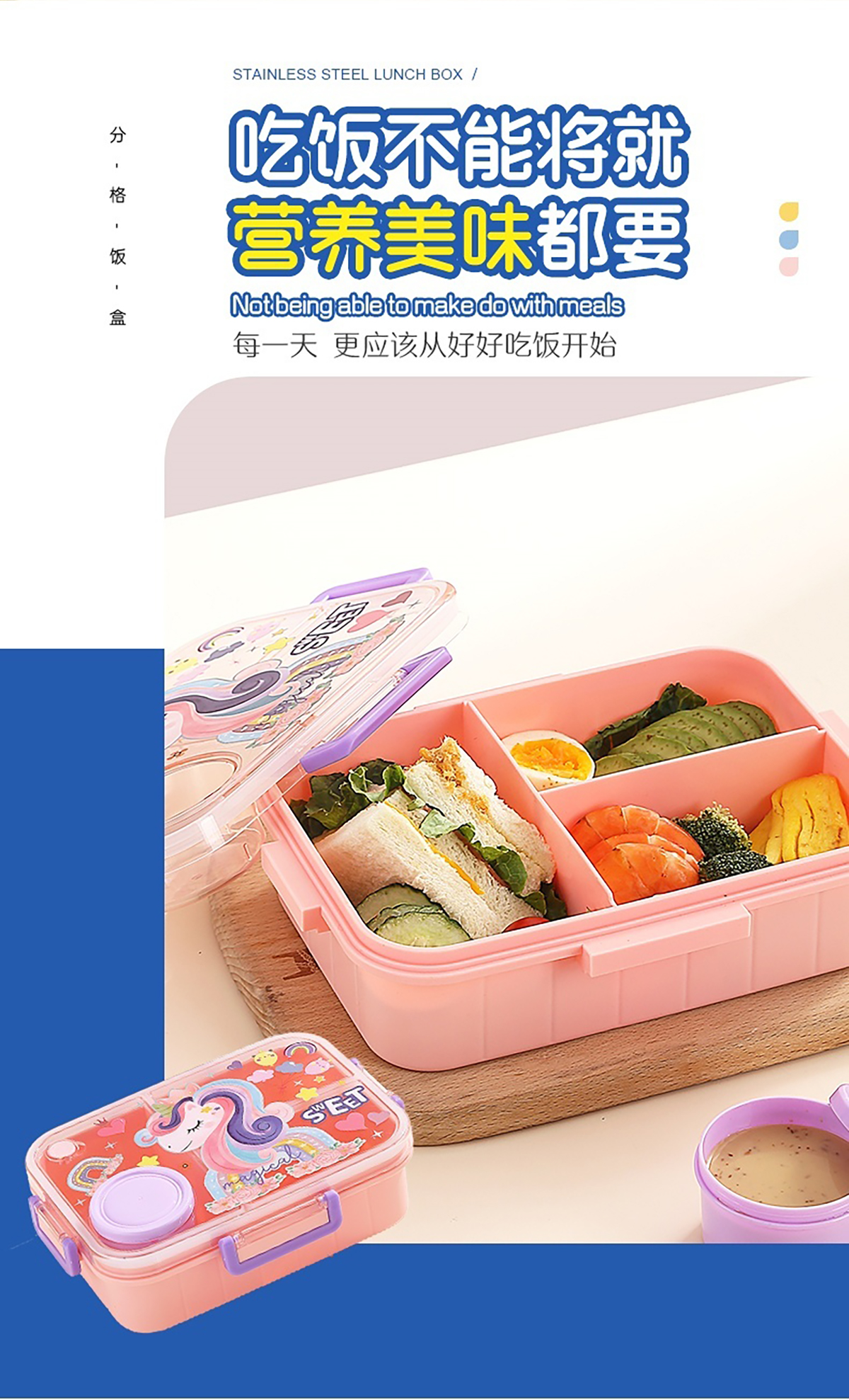 1.2L幻彩卡通獨(dú)立密封塑料餐盒(2格/3格+醬杯80ml+PP勺)