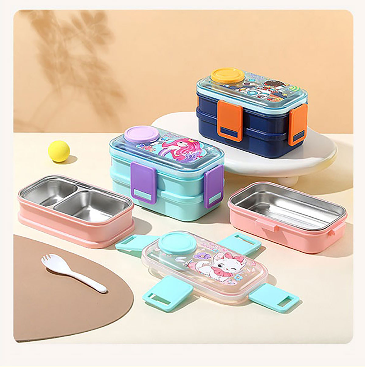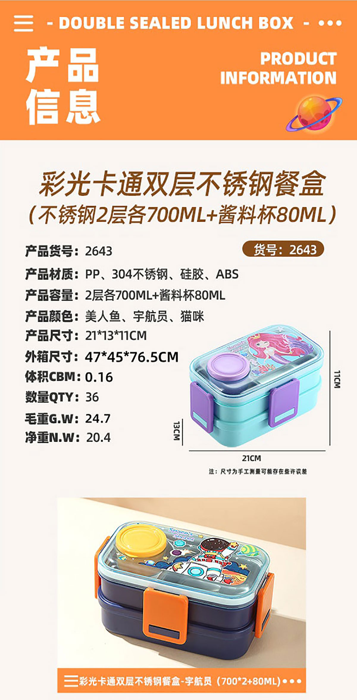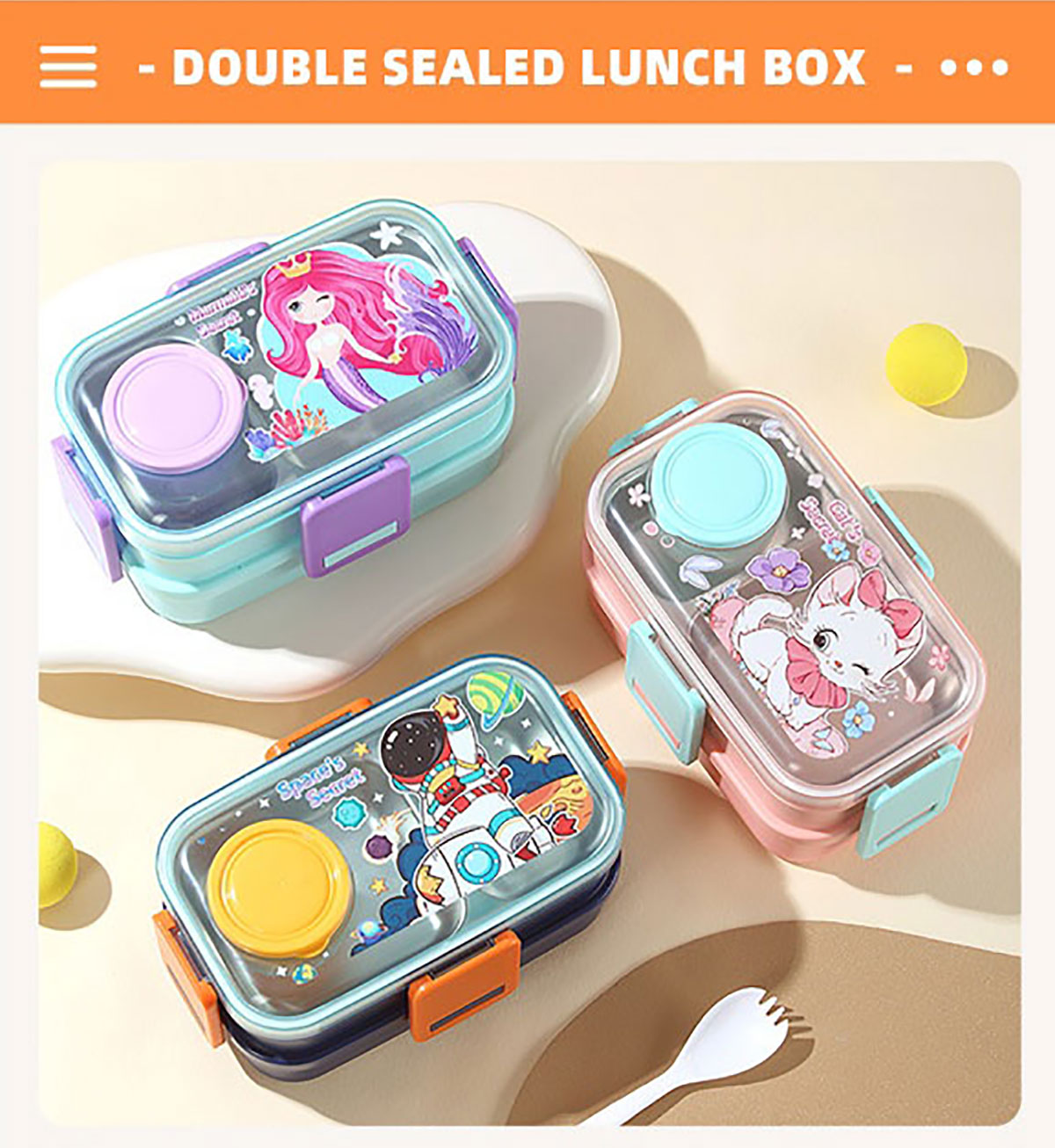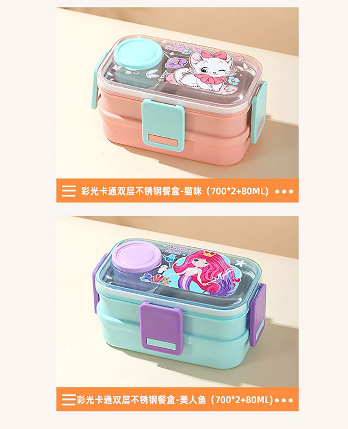 彩光卡通雙層不銹鋼餐盒(700mlx2+外置醬料杯80ml)