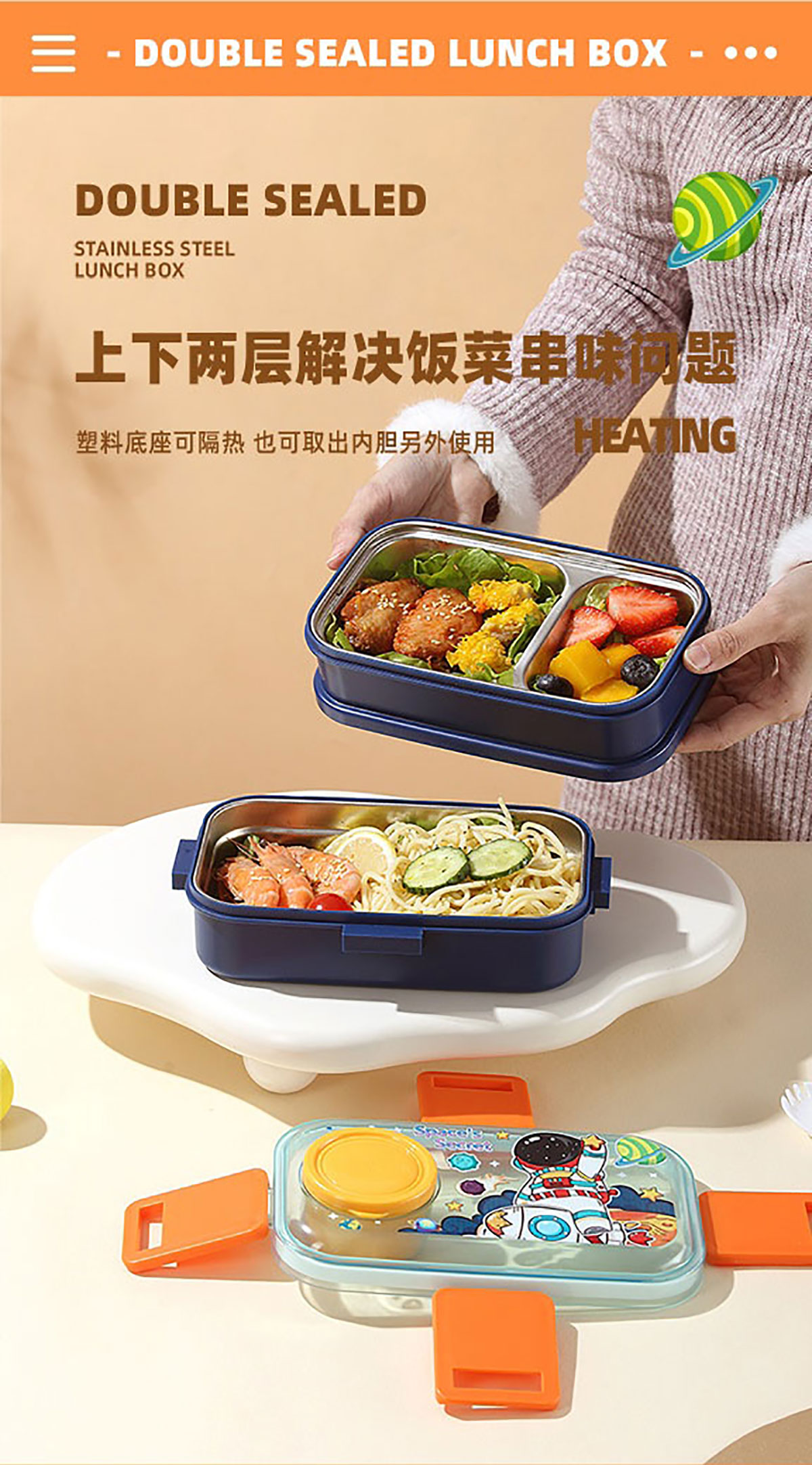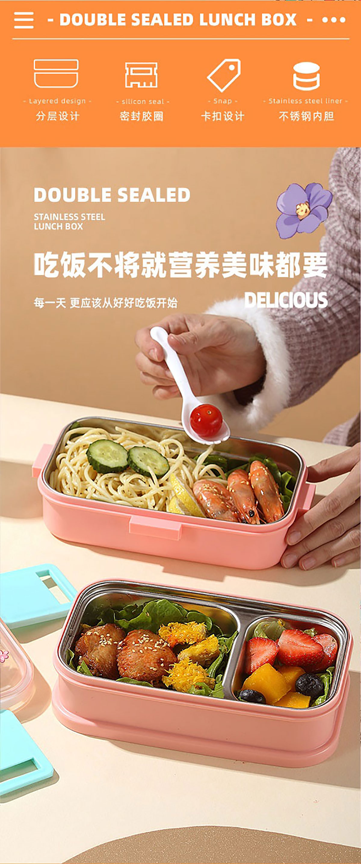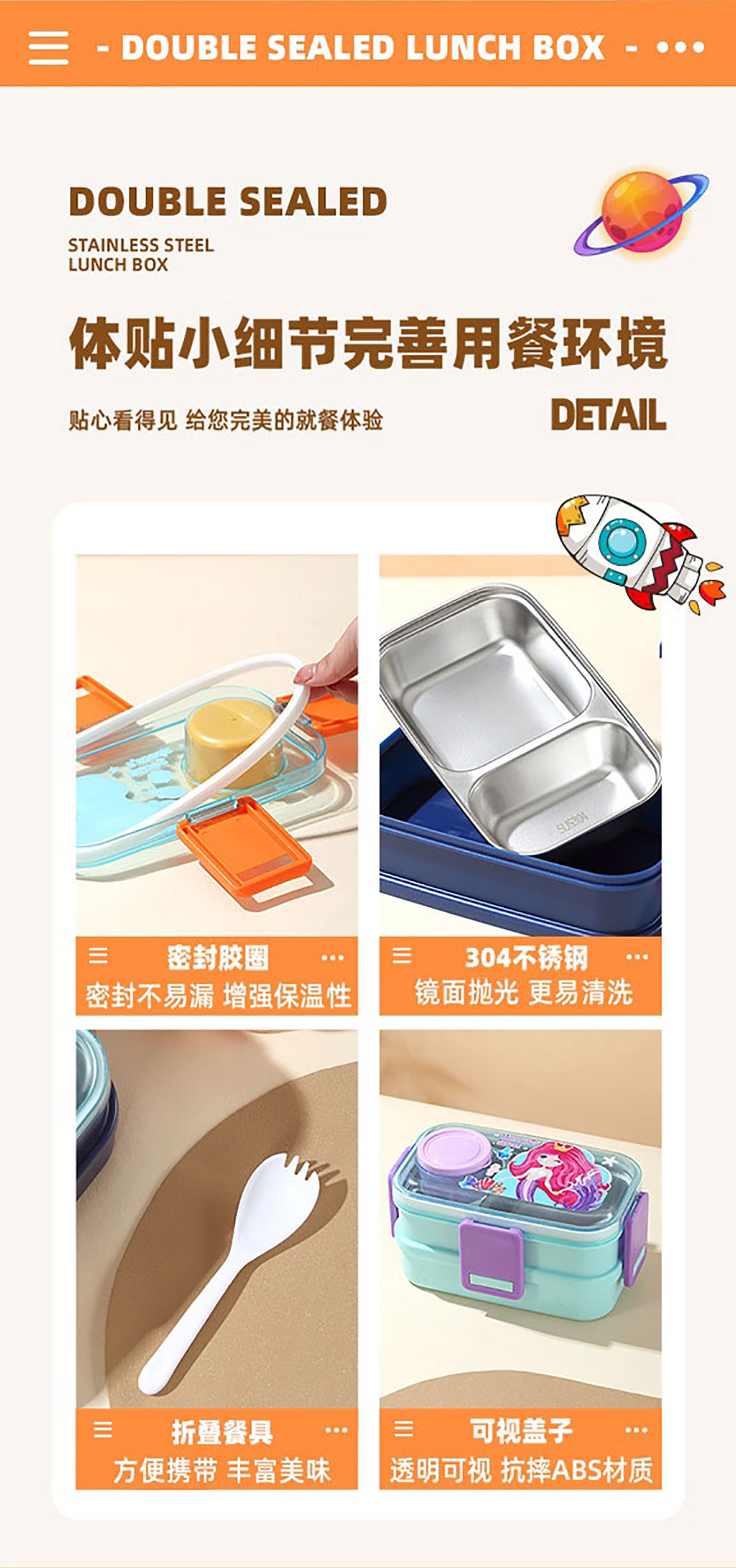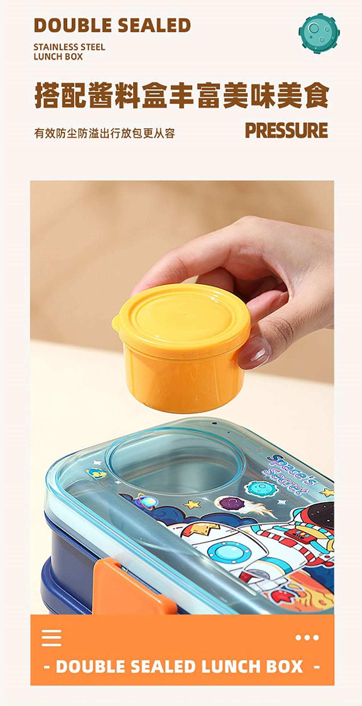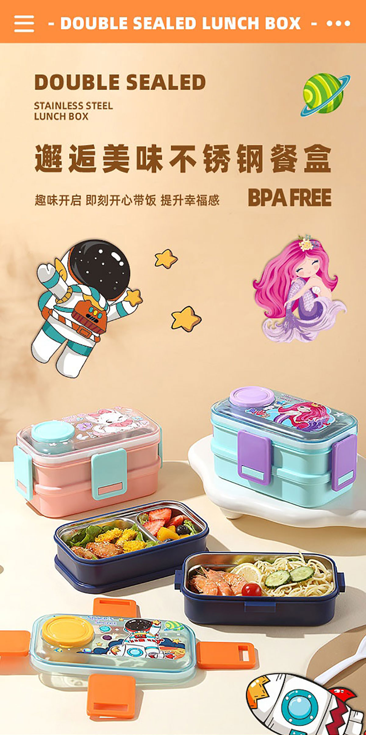 彩光卡通雙層不銹鋼餐盒(700mlx2+外置醬料杯80ml)
