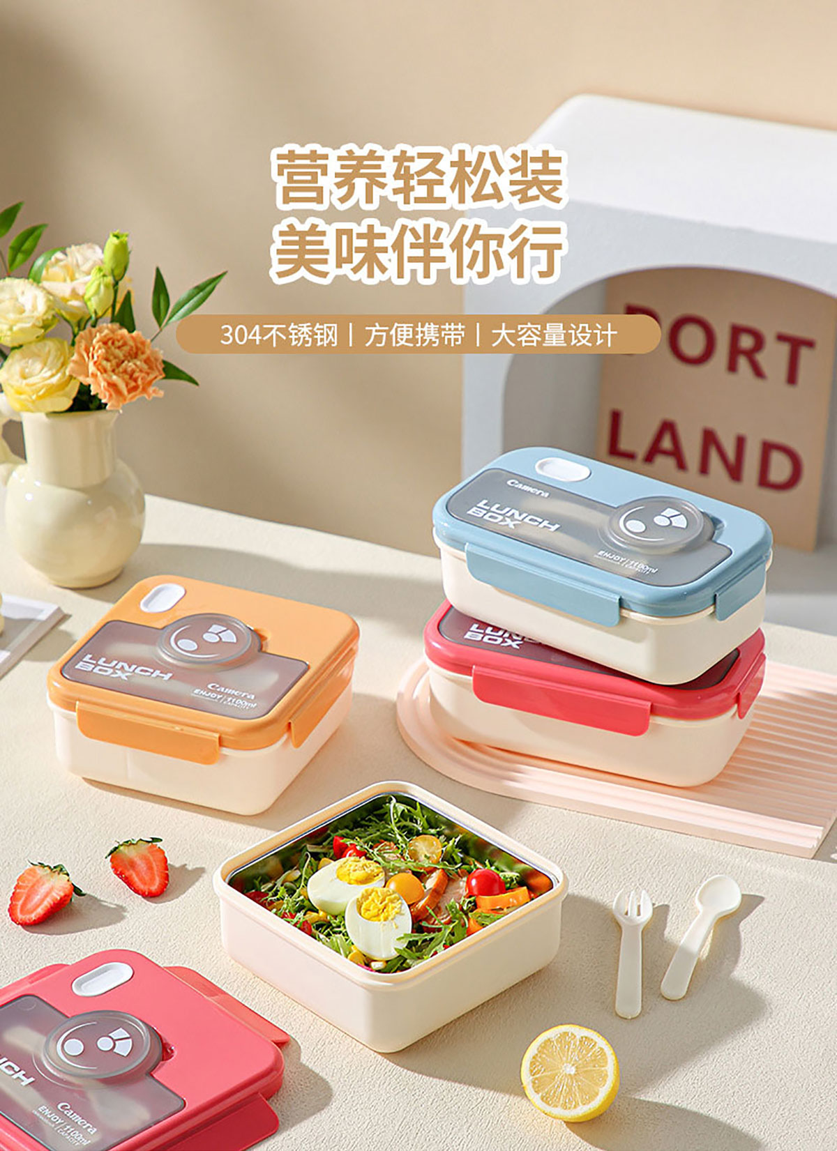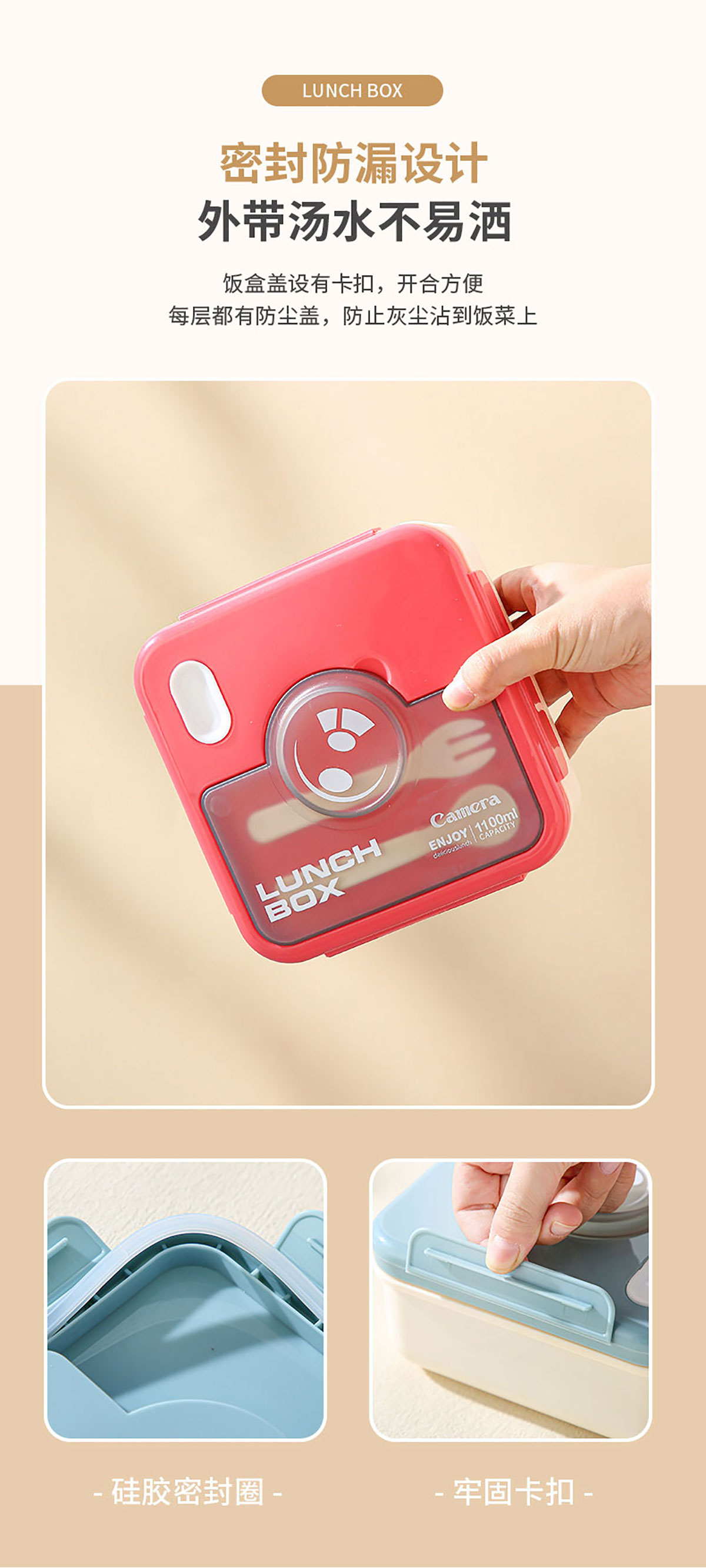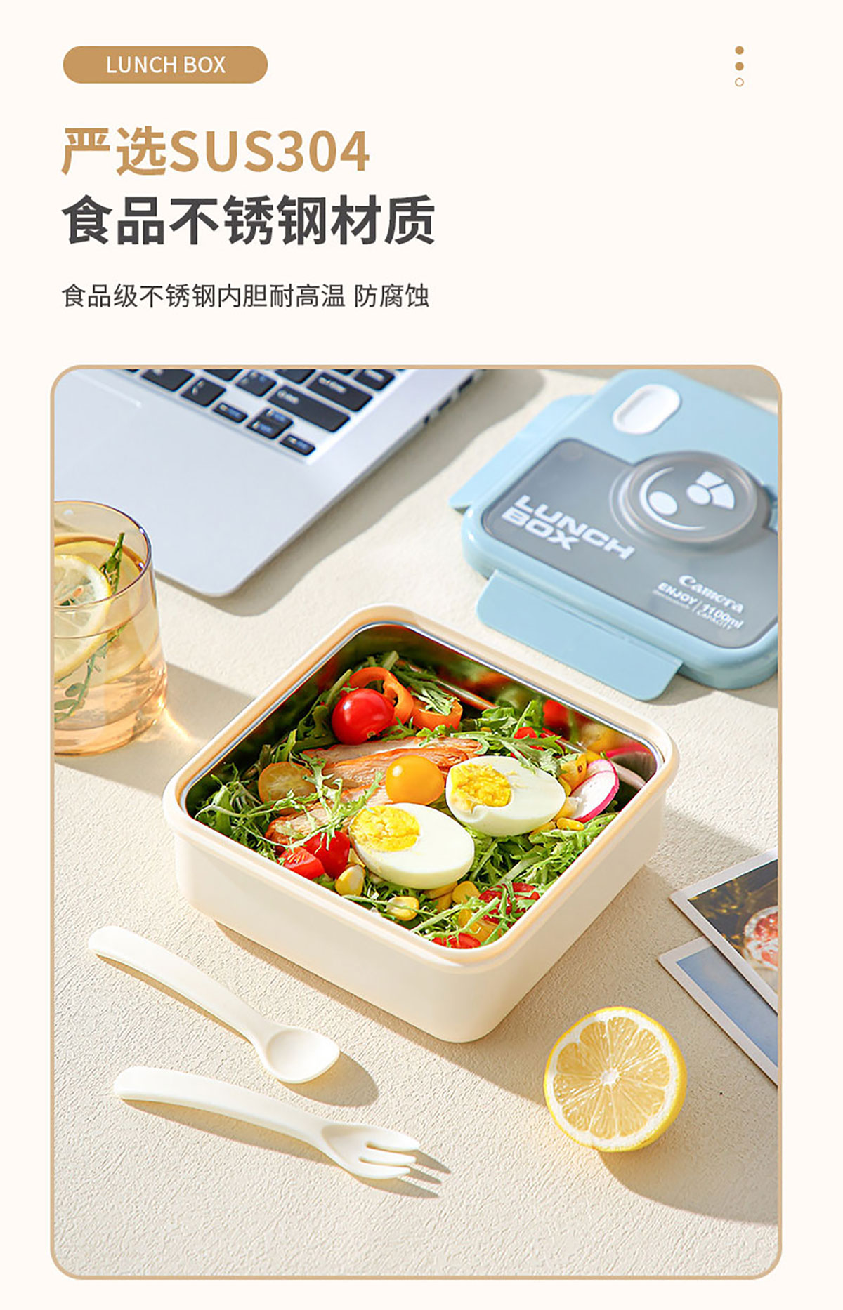 不銹鋼款正方形相機飯盒(配叉+勺)1100ml